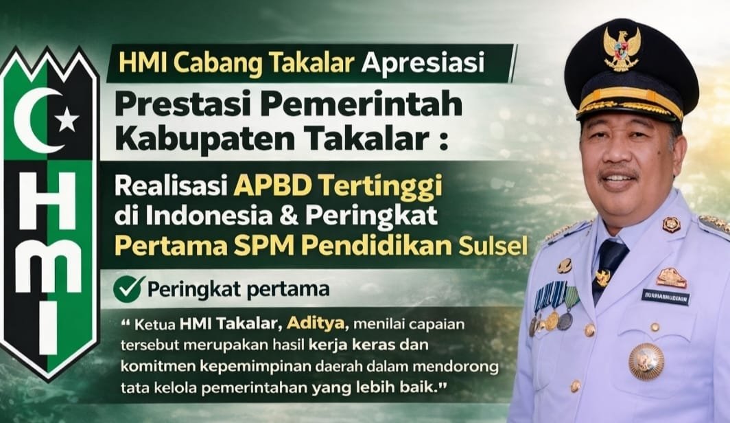 TAKALAR| SNIPERTUNTAS.COM- Prestasi yang diraih Pemerintah Kabupaten Takalar dalam pengelolaan keuangan daerah dan peningkatan pelayanan pendidikan mendapat apresiasi dari kalangan mahasiswa. Ketua Himpunan Mahasiswa Islam (HMI) Takalar, Aditya, menilai capaian tersebut merupakan bukti kerja nyata serta komitmen kepemimpinan daerah dalam membangun tata kelola pemerintahan yang lebih baik, Minggu (15/03/2026).