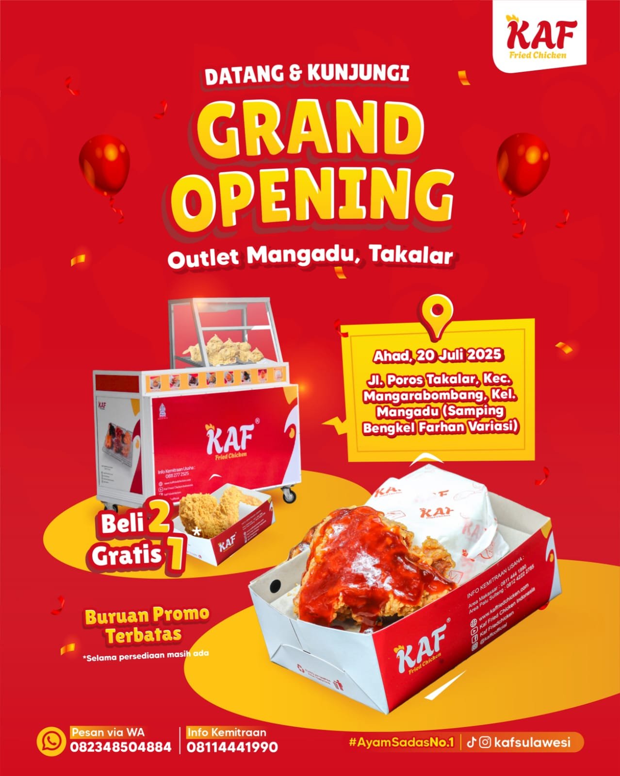 Dengan cita rasa yang konsisten dan pelayanan yang ramah, KAF Fried Chicken siap menjadi tempat favorit baru masyarakat Mangarabombang dan sekitarnya. Jangan lewatkan kesempatan mencicipi kelezatan ayam goreng yang bikin nagih. Yuk, langsung kunjungi KAF Fried Chicken hari ini juga!
