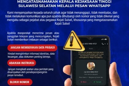 SULSEL| SNIPERTUNTAS.COM- Kejaksaan Tinggi Sulawesi Selatan (Kejati Sulsel) mengeluarkan peringatan resmi menyusul maraknya upaya penipuan yang mencatut nama pimpinan Kejaksaan Tinggi Sulawesi Selatan...