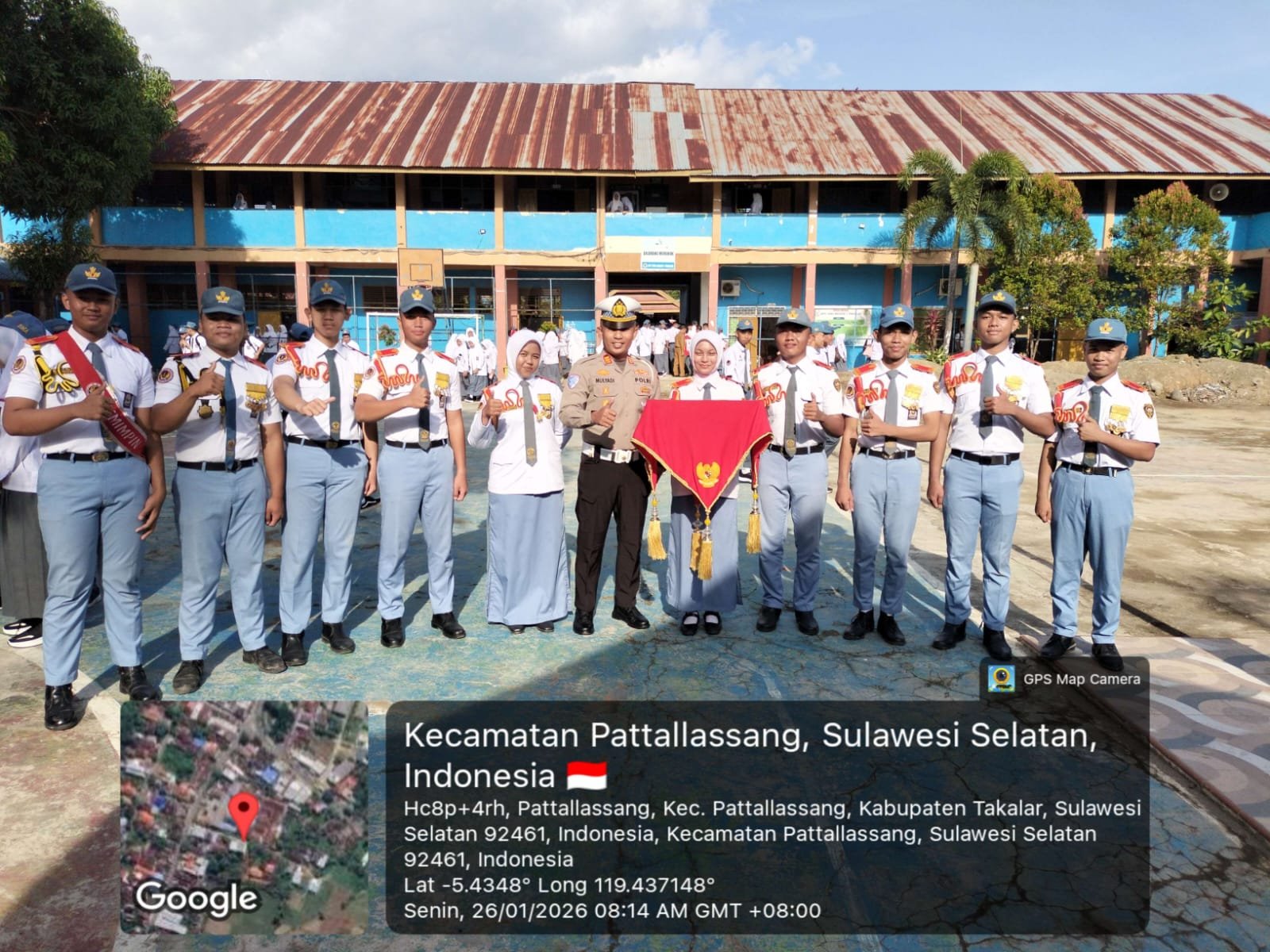 Kasat Lantas Polres Takalar AKP Mulyadi, S.Sos., M.H. bertindak sebagai Inspektur Upacara di UPT SMA Negeri 1 Takalar, didampingi BA Urmin Satlantas Briptu Eky Febrianto.