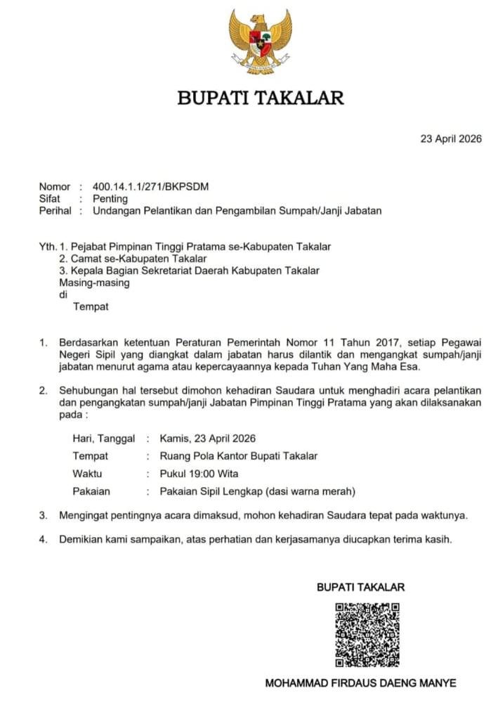 TAKALAR| SNIPERTUNTAS. COM –Gerbong mutasi di lingkungan Pemerintah Kabupaten Takalar kembali bergerak. Malam ini, Kamis (23/4/2026), Bupati Takalar, Mohammad Firdaus Daeng Manye, dijadwalkan akan melantik dan mengambil sumpah jabatan sejumlah Pejabat Pimpinan Tinggi Pratama.
