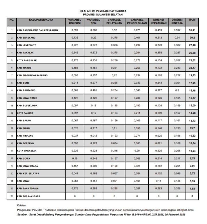 Berdasarkan Surat Deputi Bidang Pemgembangan Sumber Daya Perpustakaan No. B.844/4/APB.00.02/II.2026 tanggal 20 Februari 2026 yang dikeluarkan Perpustakaan Nasional RI, Nilai IPLM Kabupaten Takalar Tahun 2025 mencapai 26,38, dengan peringkat 4 se-Sulawesi Selatan dan 33 secara nasional.