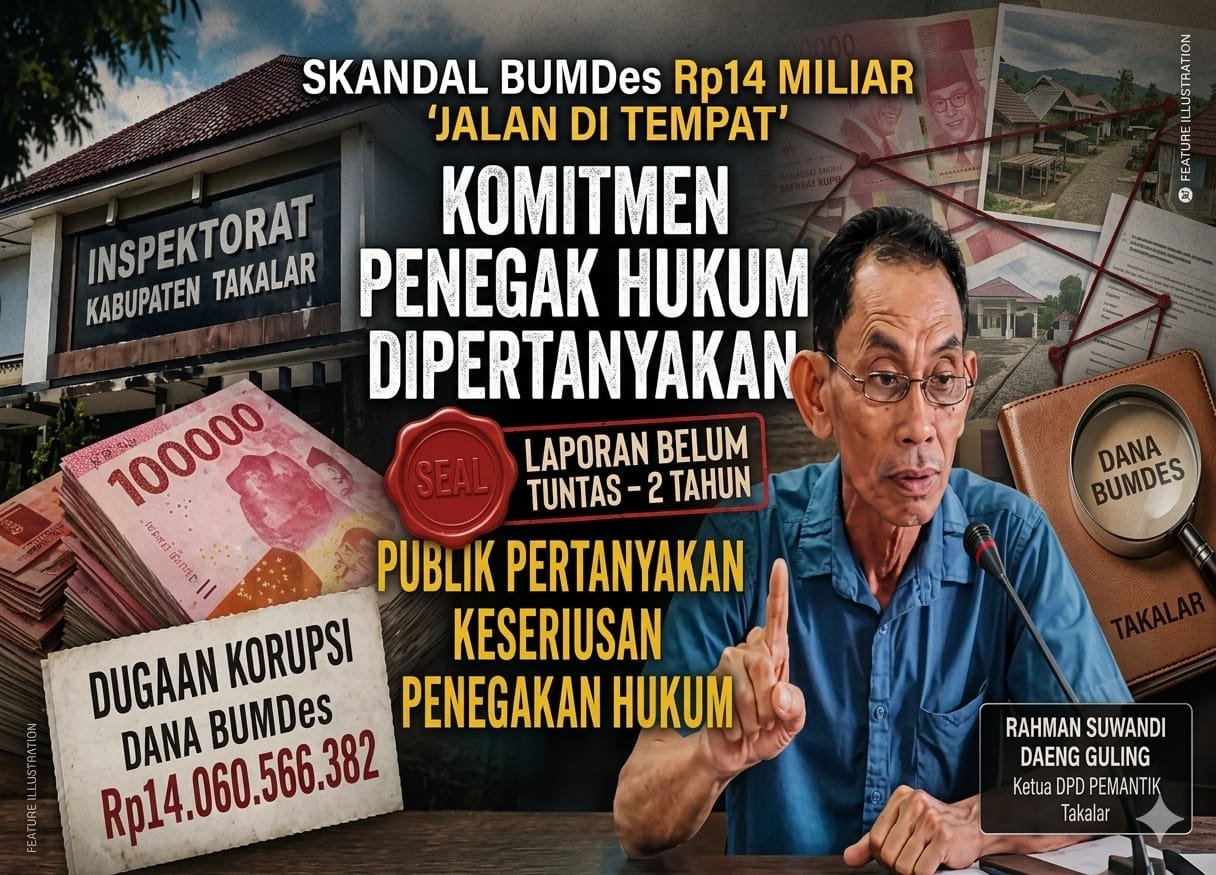 TAKALAR| SNIPERTUNTAS. COM – Penanganan kasus dugaan korupsi dana Badan Usaha Milik Desa (BUMDes) di Kabupaten Takalar senilai Rp14.060.566.382 kini berada di titik nadir. Memasuki tahun kedua sejak dilaporkan, kasus yang menyedot perhatian publik Sulawesi Selatan ini dinilai stagnan tanpa kepastian hukum yang jelas, memicu kritik tajam terhadap transparansi birokrasi dilingkup Pemerintah Kabupaten Takalar